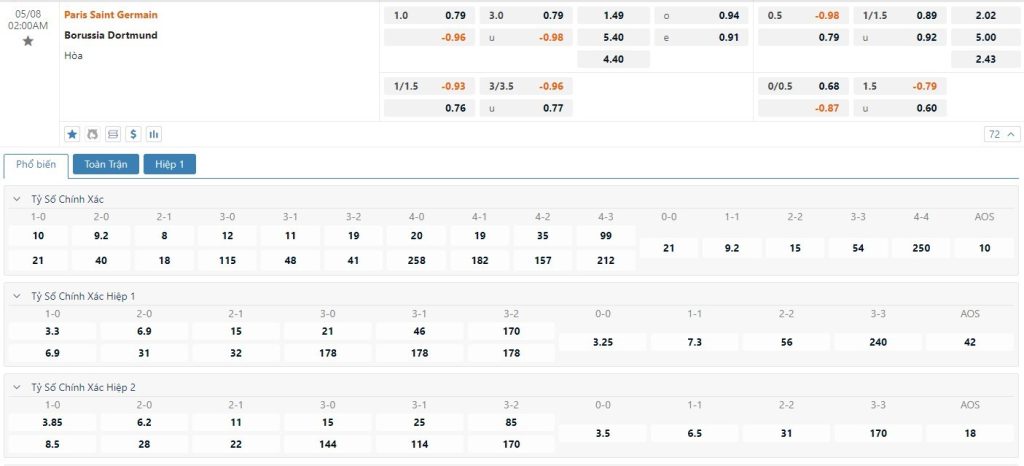 Soi kèo tài xỉu, kèo tỷ số Paris Saint-Germain vs Borussia Dortmund