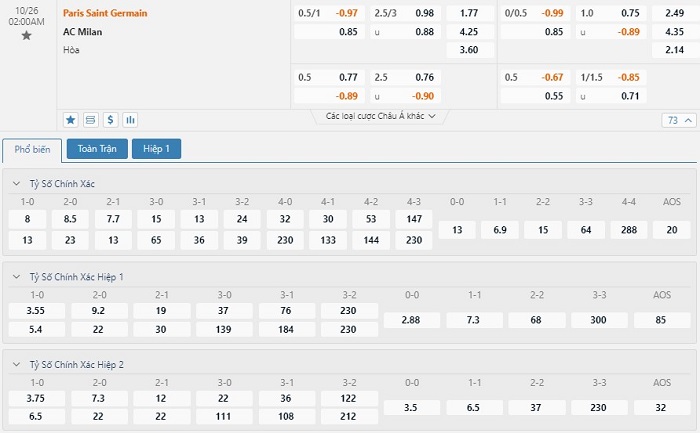 Soi kèo tài xỉu, kèo tỷ số Paris SG vs AC Milan
