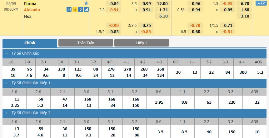 Dự đoán kèo tỷ số hiệp 1: Parma Calcio 0-2 Atalanta