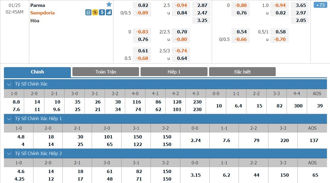5/7 trận gần nhất của Parma kết thúc với ít nhất 3 bàn thắng được ghi. Đội chủ nhà đang phòng ngự rất tệ và những trận đấu của họ đang thường xuyên xuất hiện khá nhiều bàn thắng. Sampdoria cũng là đội đang thi đấu cực kì cởi mở và ô cược tài sẽ là lựa chọn được đánh giá cao ở kèo đấu này.