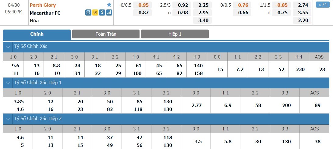 Perth Glory vẫn được đánh giá cao hơn đôi chút so với Macarthur ở kèo đấu này. Đội chủ nhà có tỷ lệ cược là 1 ăn 2.25 trong khi đó đội khách có tỷ lệ cược là 1 ăn 2.95. Tỷ số hòa có tỷ lệ cược cao nhất với 1 ăn 3.40. Perth Glory đang có phong độ rất tệ. Trước một Macarthur đang thi đấu khá lì lợm, khả năng cao Perth Glory sẽ bị cầm hòa ở trận này.