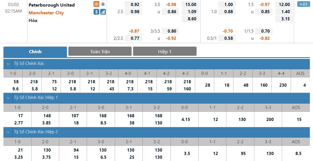 Soi kèo tổng quát Peterborough United vs Manchester City