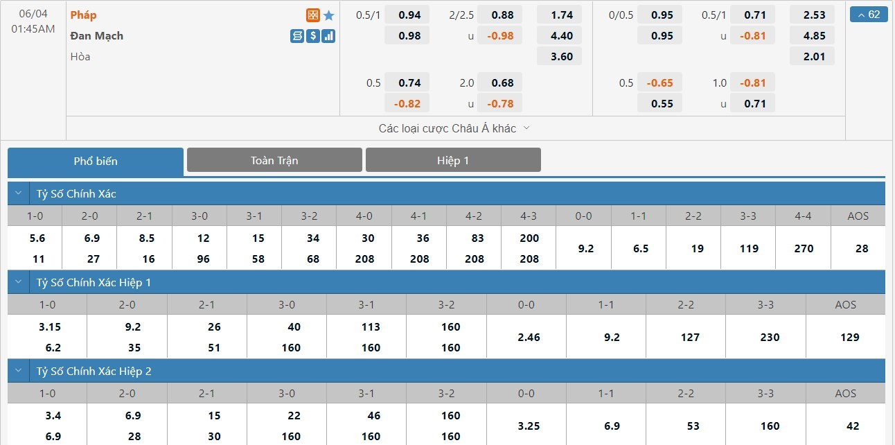 Soi kèo tài xỉu, kèo tỷ số Pháp vs Đan Mạch