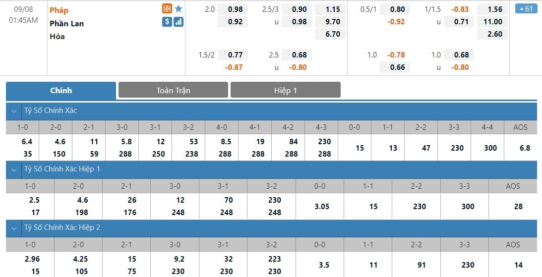 Pháp được đánh giá cao hơn Phần Lan rất nhiều ở kèo đấu này. Tỷ lệ cược của Pháp là 1 ăn 1.15 trong khi đó Phần Lan có tỷ lệ cược lên tới 1 ăn 9.70. Tỷ số hòa có tỷ lệ cược là 1 ăn 6.70. Pháp lúc này vẫn là cái tên vượt trội hơn so với Phần Lan. Được chơi trên sân nhà trước một đối thủ cũng không quá mạnh, Pháp sẽ đủ khả năng giành chiến thắng.