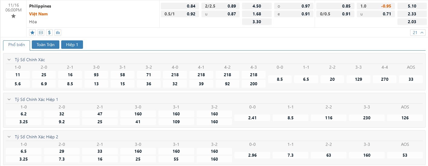 Soi kèo tài xỉu, kèo tỷ số Philippines vs Việt Nam