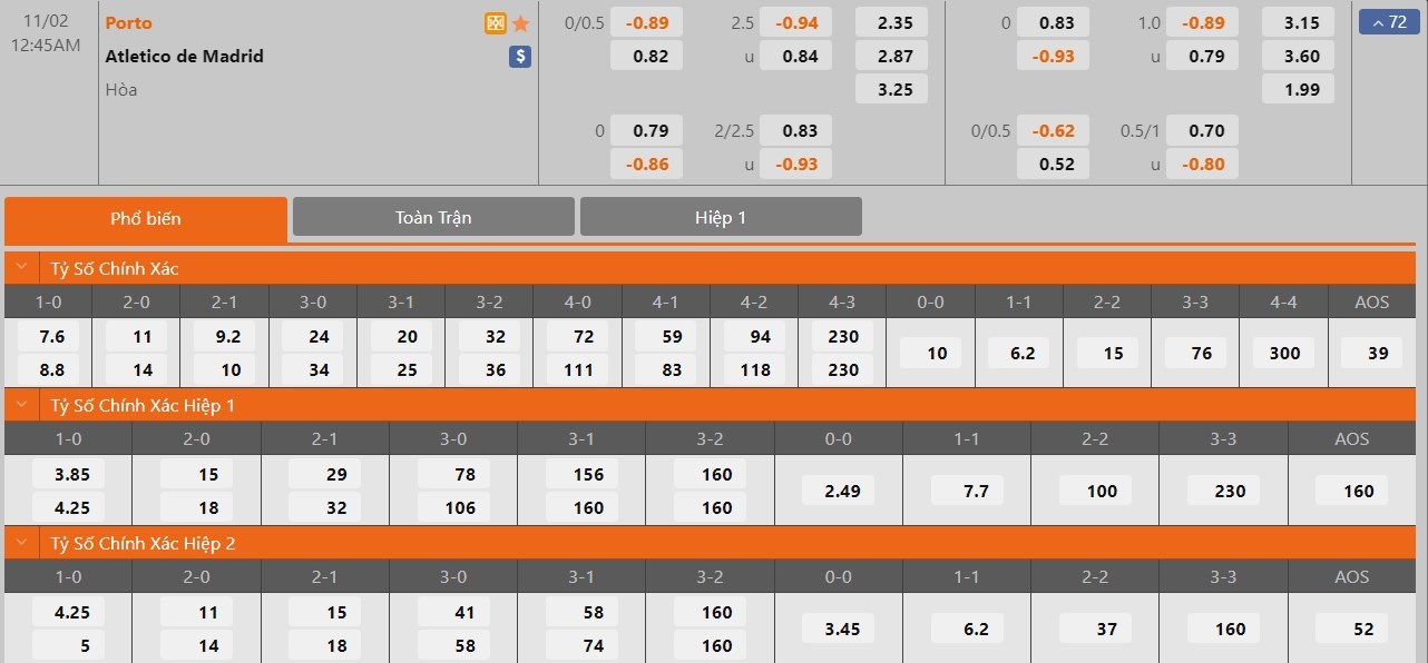 Dự đoán kèo tỷ số hiệp 1: Porto 0-2 Atletico Madrid