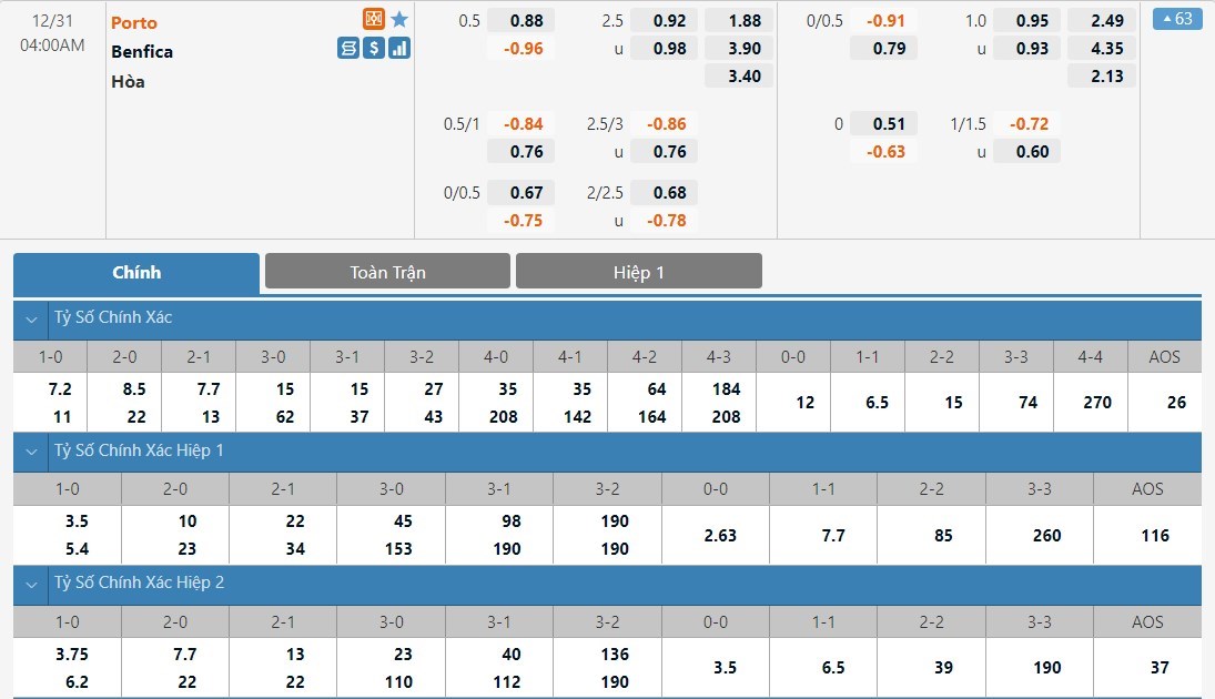 Soi kèo tài xỉu, kèo tỷ số Porto vs Benfica