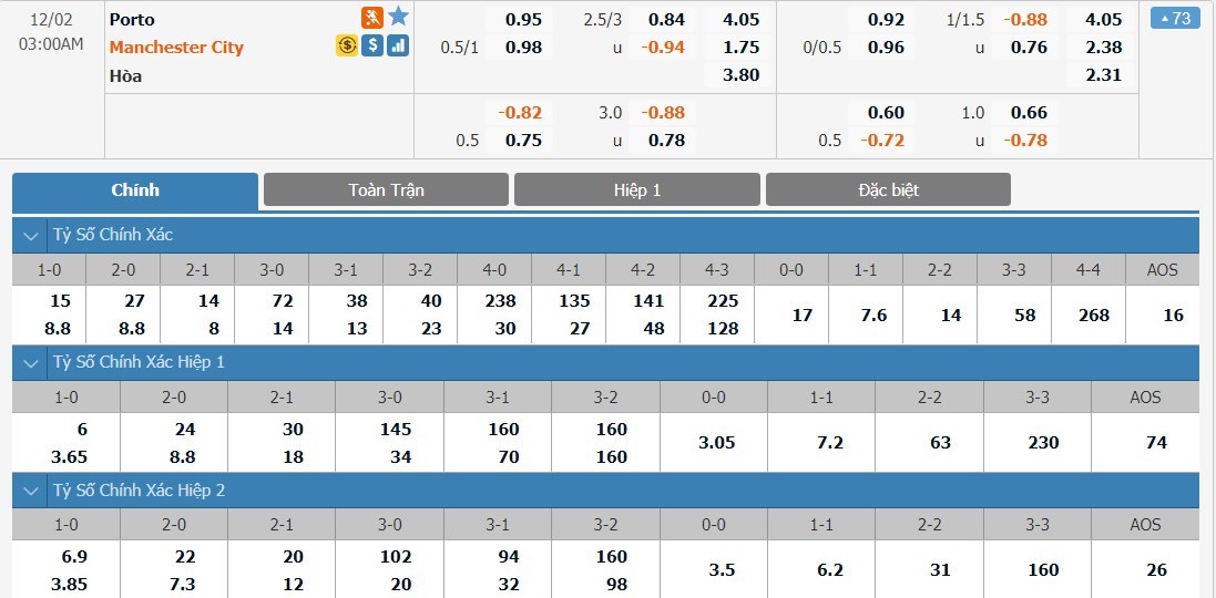 Phải thi đấu trên sân khách tuy nhiên Man City vẫn là cửa trên ở kèo đấu này. Tỷ lệ cược của Man City chỉ ở mức 1 ăn 1.75 trong khi đó Porto có tỷ lệ cược là 1 ăn 4.05. Tỷ số hòa có tỷ lệ cược 1 ăn 3.80. Man City đã có vé đi tiếp và họ có quyền giữ sức ở trận này. Phong độ của Porto cũng đang là khá cao và họ hoàn toàn có thể sẽ kiếm được 1 điểm của Man City để chính thức có vé đi tiếp.