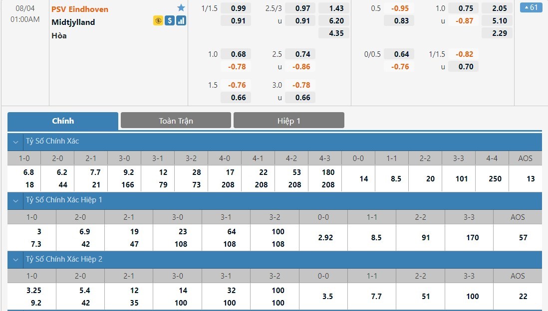 PSV Eindhoven sẽ được đánh giá cao hơn Midjylland rất nhiều ở kèo đấu này. Tỷ lệ cược của PSV sẽ chỉ là 1 ăn 1.43 trong khi đó Midtjylland có tỷ lệ cược lên tới 1 ăn 6.20. Tỷ số hòa có tỷ lệ cược là 1 ăn 4.35. PSV đang thể hiện được sức mạnh tại vòng sơ loại Champions League mùa này. Sẽ là rất khó để Midtjylland có thể tạo ra được những bất ngờ và cửa trên PSV sẽ là lựa chọn cho kèo đấu này.