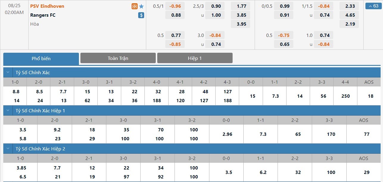 Cả 2 trận đấu gần nhất của Rangers trong đó có trận lượt đi với chính PSV đều kết thúc với tỷ số hòa 2-2. Đây là lúc mà Rangers đang thi đấu rất cởi mở và những trận đấu của họ đang thường diễn ra hấp dẫn. Trận đấu này vẫn sẽ xuất hiện nhiều bàn thắng và ô cược tài sẽ là lựa chọn cho kèo đấu này.