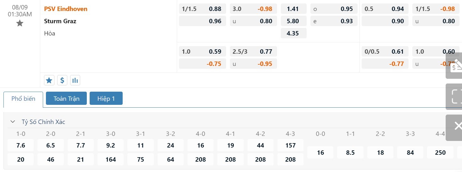 Dự đoán kèo tỷ số hiệp 1: PSV Eindhoven 1-0 Sturm Graz
