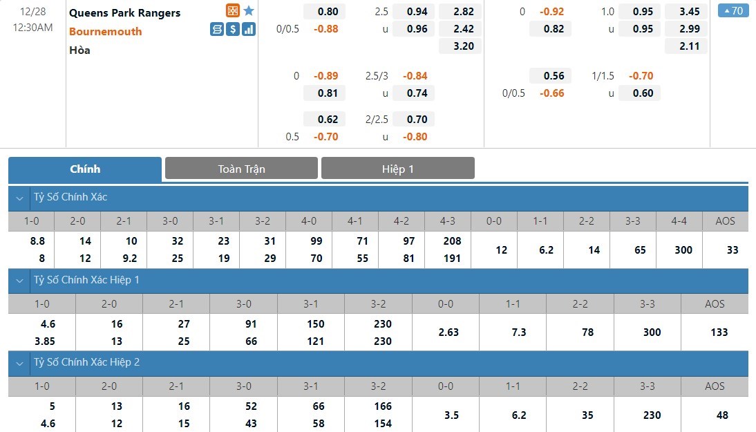 Bournemouth vẫn sẽ được đánh giá cao hơn QPR đôi chút ở trận này dù họ phải làm khách. Tỷ lệ cược của QPR là 1 ăn 2.82 trong khi đó Bournemouth có tỷ lệ cược là 1 ăn 2.42. Tỷ số hòa có tỷ lệ cược là 1 ăn 3.20. QPR vẫn đang thi đấu khá ổn ở mùa giải năm nay. Trong khi đó Bournemouth đang có phần sa sút và nhiều khả năng họ sẽ lại sảy chân ở trận này.