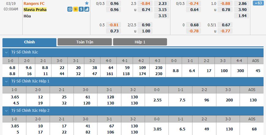 Dự đoán kèo tỷ số hiệp 1: Rangers FC 1-1 Slavia Praha