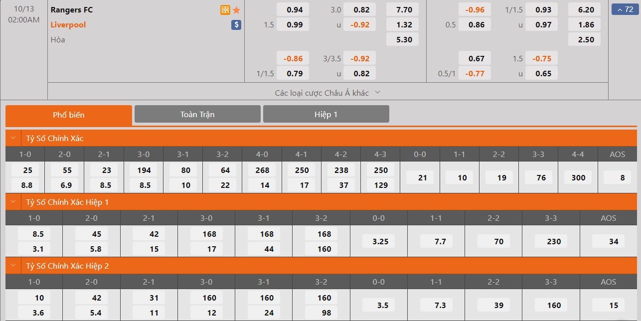 Liverpool phải làm khách nhưng vẫn sẽ được đánh giá cao hơn Rangers rất nhiều ở kèo đấu này. Kết quả Rangers thắng trận có tỷ lệ cược lên tới 1 ăn 7.70 trong khi đó kết quả Liverpool thắng trận có tỷ lệ cược là 1 ăn 1.32. Tỷ số hòa có tỷ lệ cược là 1 ăn 5.30. Liverpool lúc này vẫn là một đối thủ quá sức với Rangers và đội chủ nhà vẫn sẽ khó để tạo ra được quá nhiều bất ngờ. Với đẳng cấp vượt trội, Liverpool vẫn sẽ có được 3 điểm ở trận này.