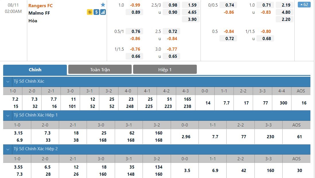 Rangers vẫn được đánh giá cao hơn Malmo rất nhiều ở kèo đấu này. Tỷ lệ cược của Rangers là 1 ăn 1.59 trong khi đó Malmo có tỷ lệ cược lên tới 1 ăn 4.65. Tỷ số hòa có tỷ lệ cược là 1 ăn 3.90. Phong độ của Rangers đang là rất tệ trong khi đó Malmo đang cho thấy họ là cái tên không dễ bị bắt nạt. Ở kèo đấu này, ô cược hòa sẽ là lựa chọn được đánh giá cao.