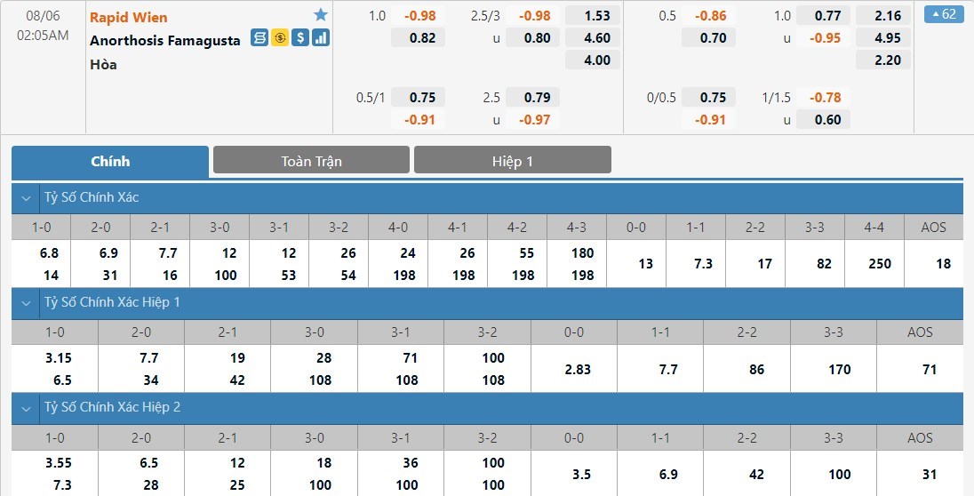 Dự đoán kèo tỷ số hiệp 1: Rapid Wien 2-0 Anorthosis Famagusta