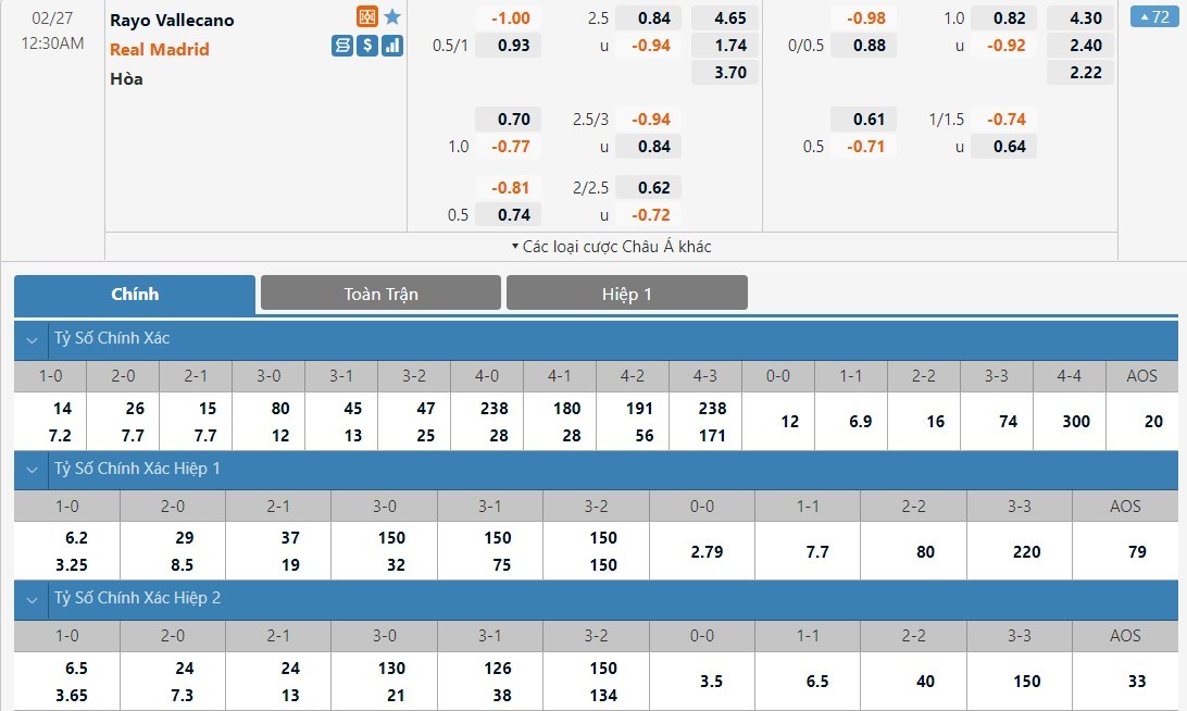 Soi kèo châu Á Rayo Vallecano vs Real Madrid