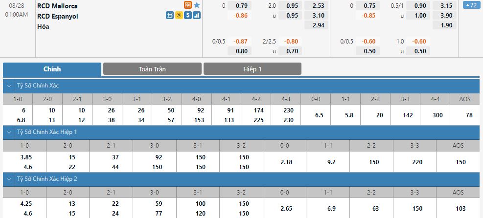 Soi kèo tài xỉu, kèo tỷ số RCD Mallorca vs RCD Espanyol