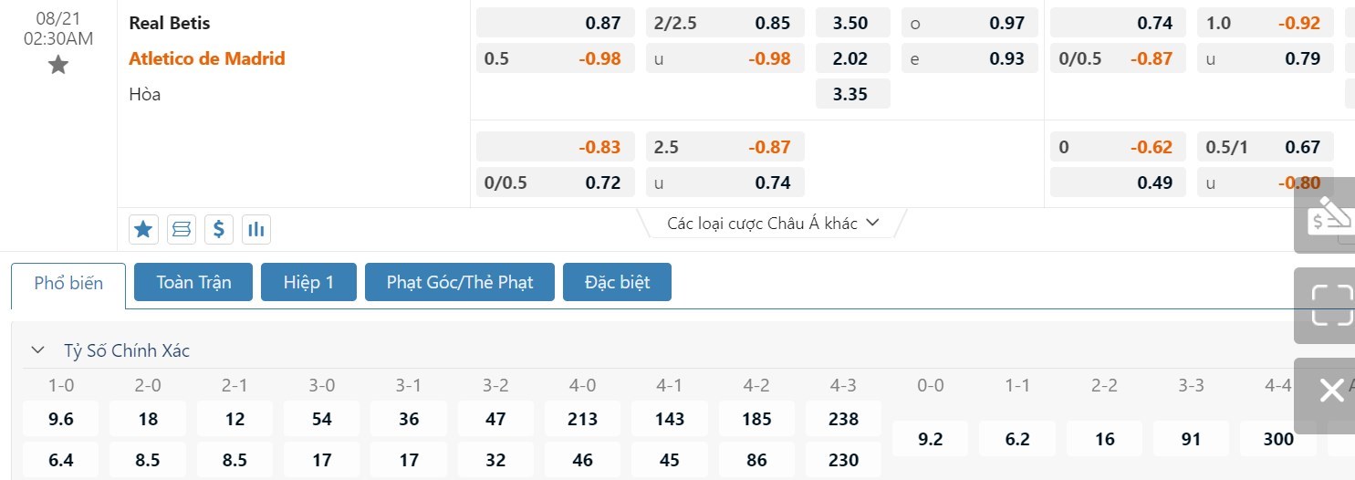 Soi kèo châu Á Real Betis vs Atletico Madrid