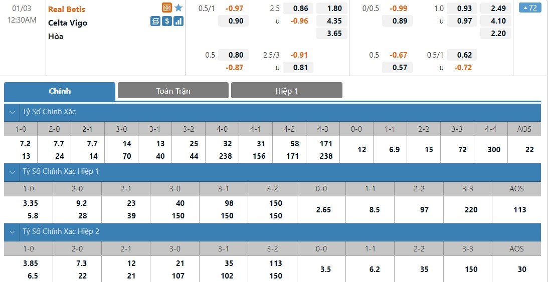 Dự đoán kèo tỷ số hiệp 1: Real Betis 1-1 Celta Vigo