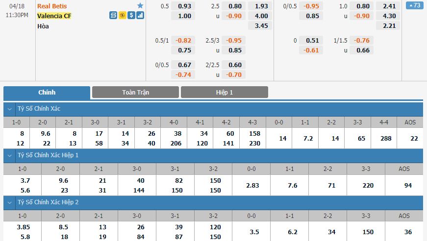 Dự đoán kèo tỷ số hiệp 1: Real Betis 1-0 Valencia