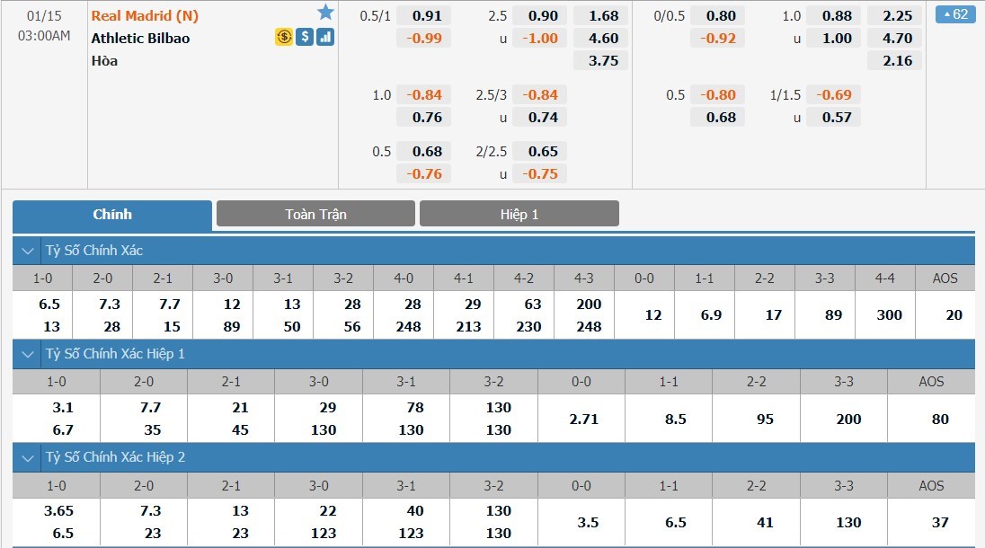 Real Madrid vẫn được đánh giá cao hơn Athletic Bilbao khá nhiều ở kèo đấu này. Tỷ lệ cược của Real Madrid chỉ là 1 ăn 1.68 trong khi đó Bilbao có tỷ lệ cược lên tới 1 ăn 4.60. Tỷ số hòa có tỷ lệ cược là 1 ăn 3.75. Đây là giai đoạn mà Real Madrid lại tỏ ra thiếu ổn định. Trước một Bilbao không dễ bị bắt nạt, Real Madrid nhiều khả năng sẽ bị cầm hòa ở 90 phút thi đấu chính thức.