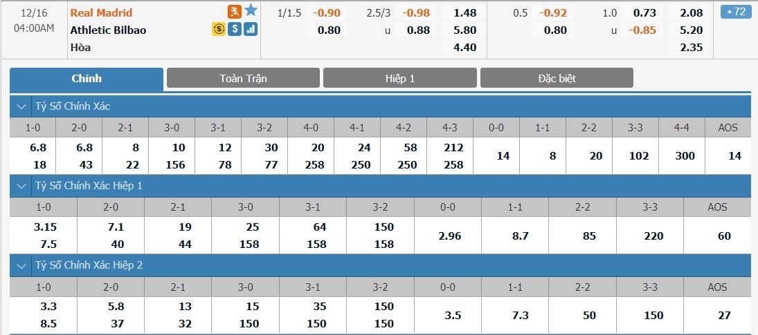 Dự đoán kèo tỷ số hiệp 1: Real Madrid 2-0 Athletic Bilbao