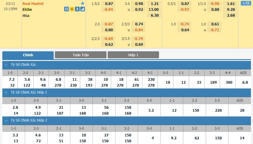 Kèo châu Âu hiệp 1: Real Madrid