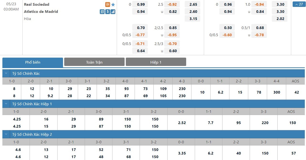 Dự đoán kèo tỷ số hiệp 1: Real Sociedad 0-0 Atletico Madrid