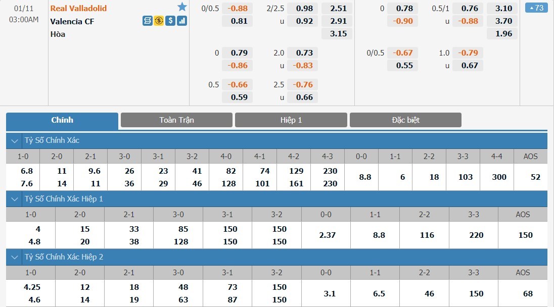 Dự đoán kèo tỷ số hiệp 1: Real Valladolid 0-1 Valencia