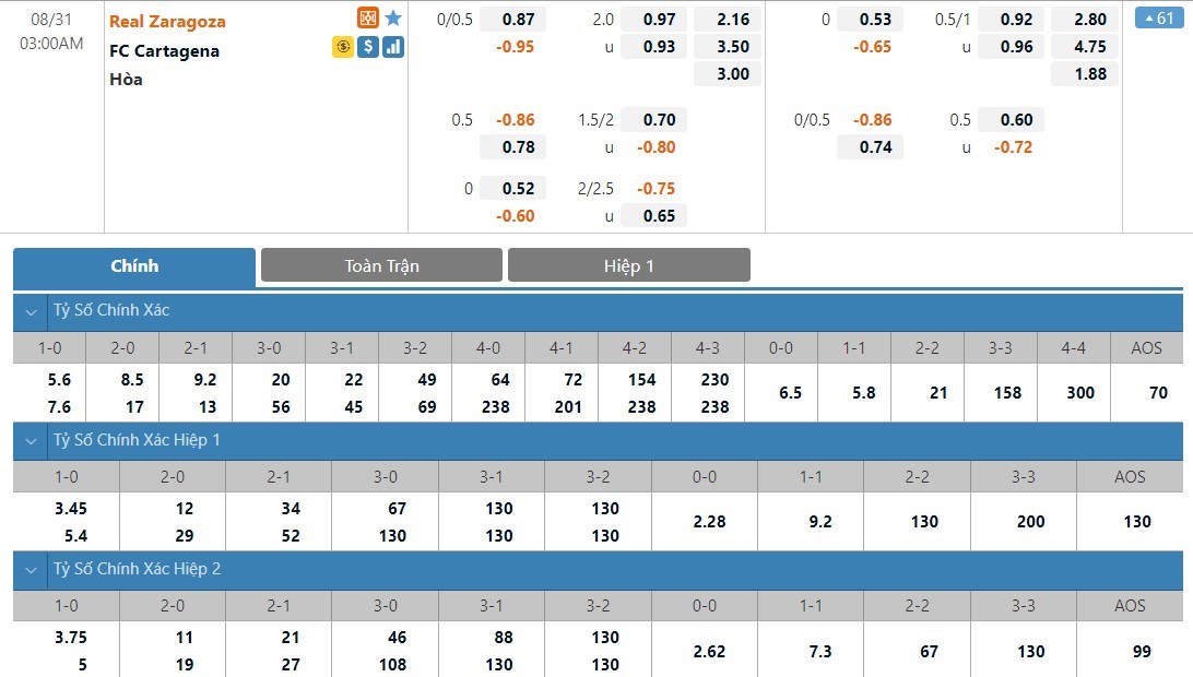 Sau 2 vòng đấu đầu tiên, Real Zaragoza chưa ghi nổi bàn thắng nào trong khi đó Cartagena mới chỉ có đúng 1 bàn. Cả 2 đội bóng này đều đang thi đấu cực kì nghèo nàn và thiếu hiệu quả. Trận đấu của 2 đội đều đang thi đấu tệ được dự đoán sẽ diễn ra kém hấp dẫn và bàn thắng có thể sẽ không xuất hiện. Ở kèo đấu này, ô cược xỉu sẽ là lựa chọn hợp lý.