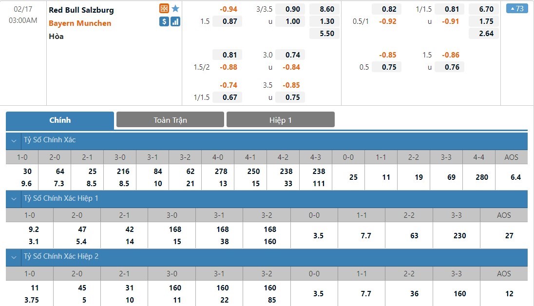 Tỷ lệ cược của Bayern Munich và Red Bull Salzburg ở kèo đấu này sẽ có sự chênh lệch rất lớn. Bayern Munich chỉ có tỷ lệ cược là 1 ăn 1.30 trong khi đó Red Bull Salzburg có tỷ lệ cược lên tới 1 ăn 8.60. Tỷ số hòa có tỷ lệ cược là 1 ăn 5.50. Bayern Munich lúc này có đẳng cấp vượt trội hoàn toàn so với Red Bull Salzburg và đội khách sẽ không gặp quá nhiều khó khăn để có được chiến thắng ở trận này.