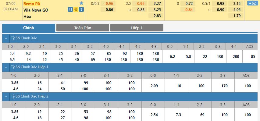 Dự đoán kèo tỷ số hiệp 1: Remo PA 0-2 Vila Nova