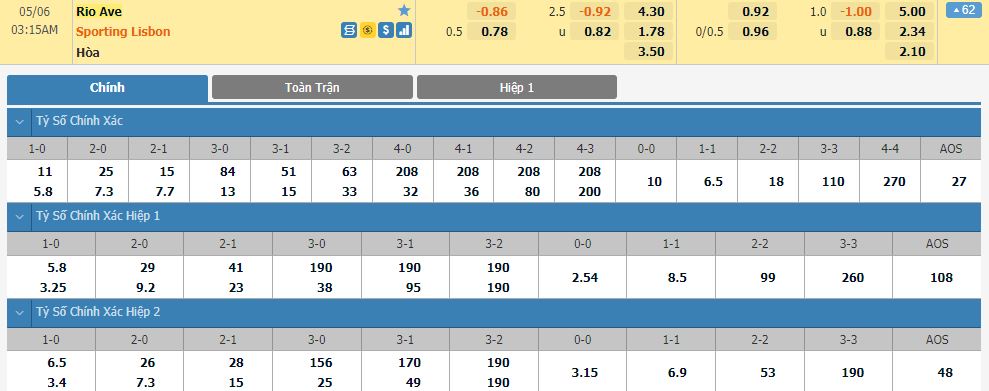 Dự đoán kèo tỷ số hiệp 1: Rio Ave 0-0 Sporting CP