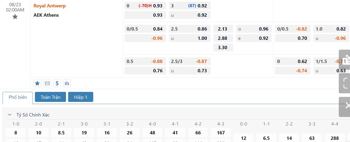 Soi kèo tài xỉu, kèo tỷ số Royal Antwerp FC vs AEK Athens