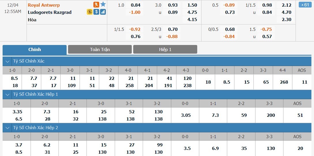 Dự đoán kèo tỷ số hiệp 1: Royal Antwerp 2-0 Ludogorets