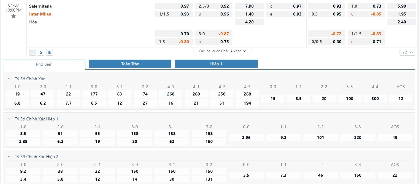 Soi kèo châu Á Salernitana vs Inter Milan