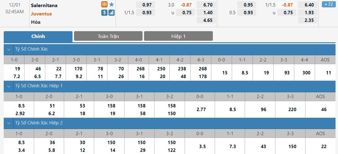 Dự đoán kèo tỷ số hiệp 1: Salernitana 0-2 Juventus