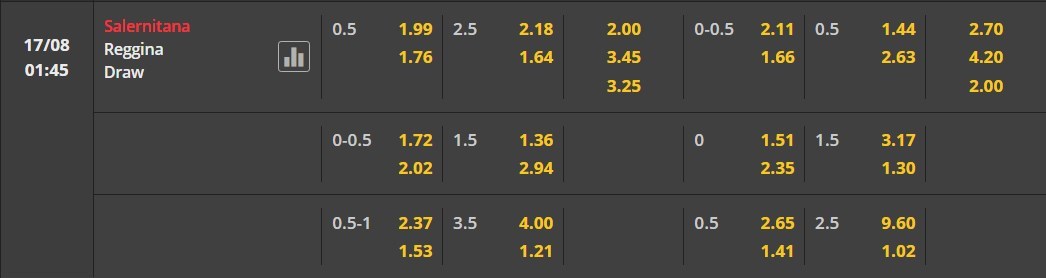 Reggina đang có phong độ khá tốt. Trong 3 trận giao hữu trước thềm mùa giải mới của mình, Reggina chỉ thua 1 trận và họ thắng tới 2 trận. Trên sân khách ở những trận đấu gần đây, Reggina cũng thường có những màn thể hiện ấn tượng. Ở cả 5 trận sân khách gần nhất của mình, Reggina đều không thua và họ cũng là cửa cược thắng kèo ở cả 5 trận đấu nói trên. Đối thủ của Reggina ở trận này cũng chỉ là một Salernitana không quá đáng ngại và Reggina hoàn toàn có thể sẽ có thêm 1 trận đấu tốt. Trong 2 lần gặp Salernitana lại Serie B mùa trước, Reggina cũng đều kiếm được những kết quả hòa. Ở kèo đấu này, cửa dưới Reggina sẽ là lựa chọn được đánh giá cao hơn.