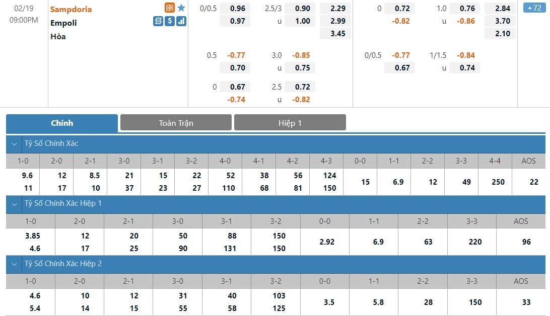 Dự đoán kèo tỷ số hiệp 1: Sampdoria 0-2 Empoli