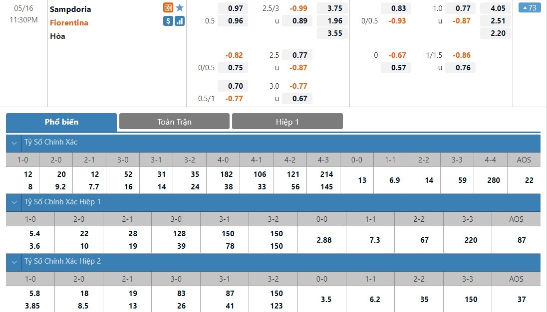 Phải làm khách nhưng Fiorentina vẫn sẽ là cửa trên ở trận này. Kết quả Fiorentina thắng trận chỉ có tỷ lệ cược là 1 ăn 1.96 trong khi đó kết quả Sampdoria thắng trận có tỷ lệ cược lên tới 1 ăn 3.75. Tỷ số hòa có tỷ lệ cược là 1 ăn 3.55. Fiorentina ở giai đoạn cuối mùa đang chơi không quá ổn định. Phong độ của Sampdoria cũng đang là không tệ và với lợi thế sân nhà, Sampdoria có thể sẽ có được 1 điểm ở trận này.