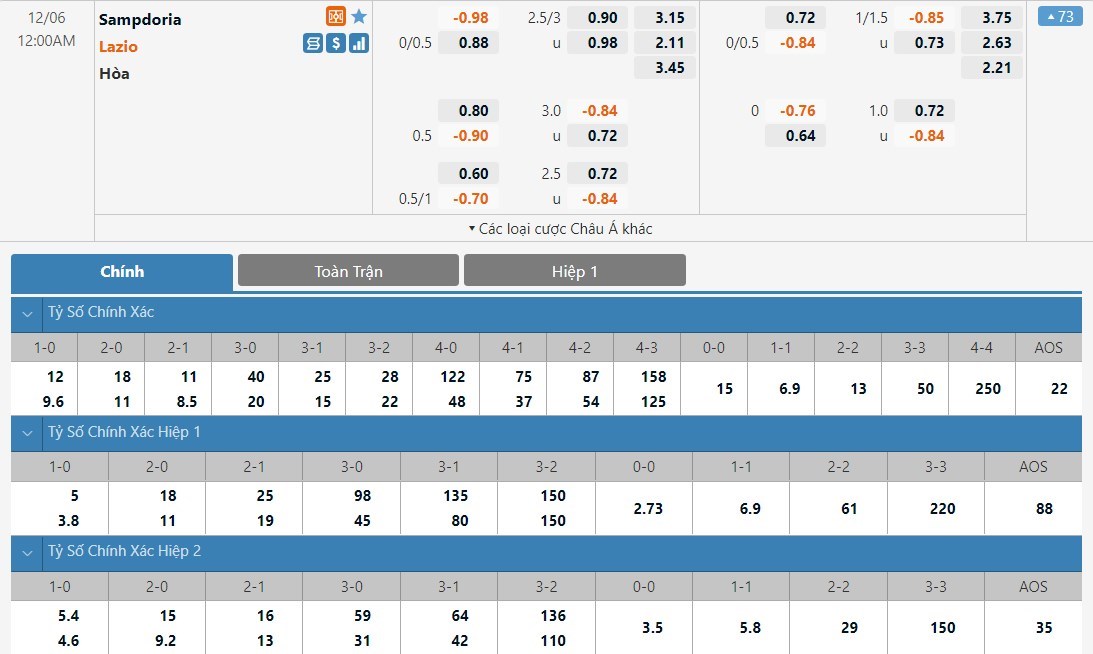 Dự đoán kèo tỷ số hiệp 1: Sampdoria 0-2 Lazio