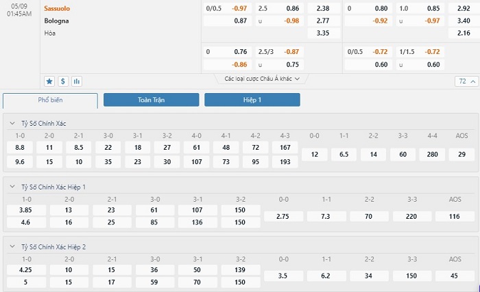 Soi kèo tài xỉu, kèo tỷ số Sassuolo vs Bologna