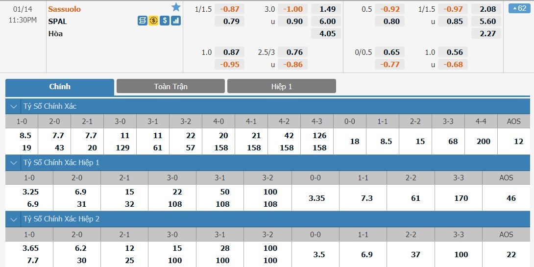 Không bất ngờ khi Sassuolo được đánh giá cao hơn Spal rất nhiều ở kèo đấu này. Đội chủ nhà chỉ có tỷ lệ cược là 1 ăn 1.49 trong khi đó đội khách có tỷ lệ cược lên tới 1 ăn 6.00. Tỷ số hòa có tỷ lệ cược là 1 ăn 4.05. Sassuolo mùa này thi đấu tốt và họ thường có chiến thắng ấn tượng trước những đối thủ dưới cơ. Spal chỉ là một đội hạng 2 và Sassuolo sẽ không gặp quá nhiều khó khăn để có chiến thắng ở trận này.