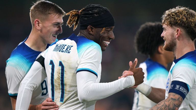Anh: Pickford, Walker, Stones, Guehi, Trippier, Mainoo, Rice, Palmer, Foden, Gordon, Kane.
