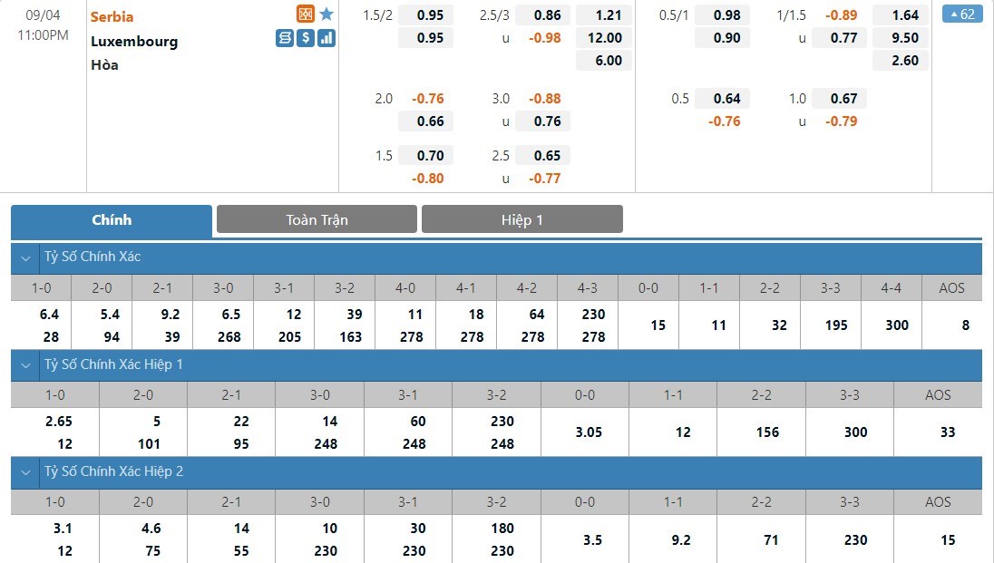Dự đoán kèo tỷ số hiệp 1: Serbia 0-0 Luxembourg
