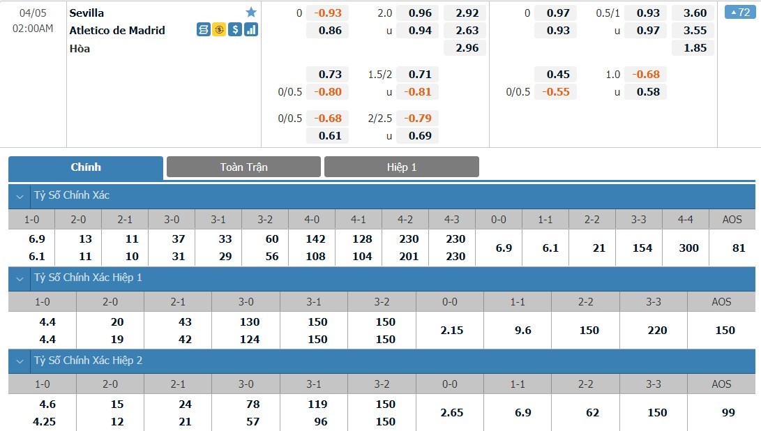 Soi kèo châu Á Sevilla vs Atletico Madrid