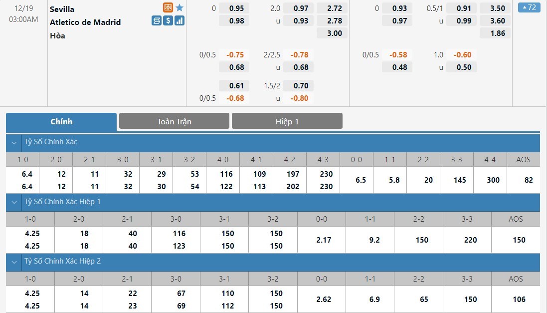 Soi kèo châu Á Sevilla vs Atletico Madrid
