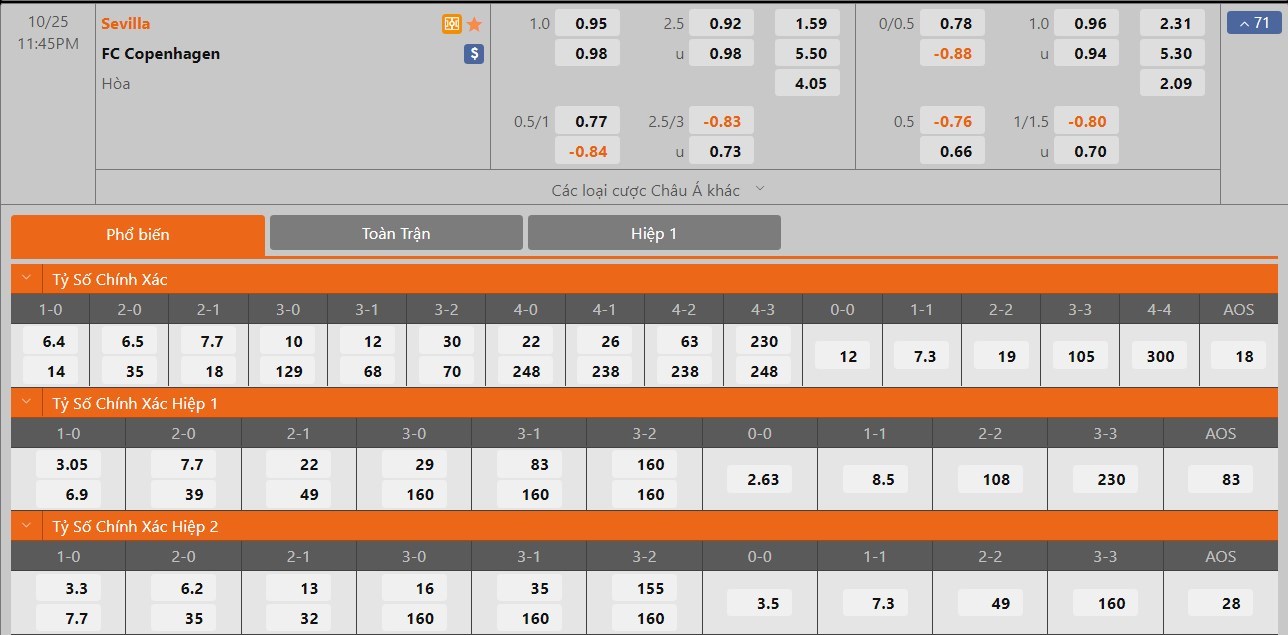 Tỷ lệ cược của Sevilla và Copenhagen ở kèo đấu này có sự chênh lệch rất lớn. Kết quả Sevilla thắng trận có tỷ lệ cược chỉ là 1 ăn 1.59 trong khi đó kết quả Copenhagen thắng trận có tỷ lệ cược là 1 ăn 5.50. Tỷ số hòa có tỷ lệ cược là 1 ăn 4.05. Xét về chất lượng đội hình và cả trình độ, Sevilla vẫn đang nhỉnh hơn Copenhagen không ít. Đây còn là trận đấu mà Sevilla có lợi thế sân nhà và họ có thể vẫn sẽ có được 3 điểm quan trọng.