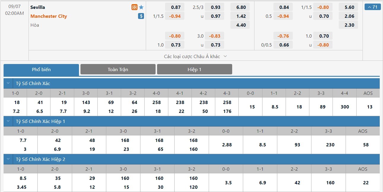 Man City phải làm khách nhưng họ vẫn sẽ được đánh giá cao hơn Sevilla khá nhiều ở trận này. Kết quả Man City thắng trận chỉ có tỷ lệ cược là 1 ăn 1.42 trong khi đó kết quả Sevilla thắng trận có tỷ lệ cược lên tới 1 ăn 6.80. Tỷ số hòa có tỷ lệ cược là 1 ăn 4.40. Trình độ của Man City so với Sevilla đang là vượt trội hơn nhiều và Man City sẽ là đội chơi áp đảo. Đội khách sẽ là cái tên có được chiến thắng ở trận này.